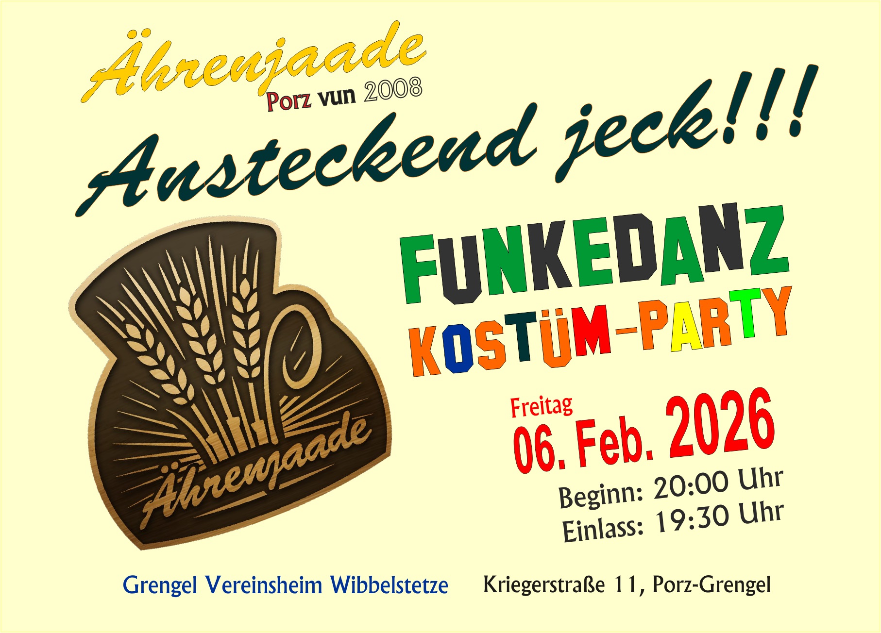 Und unseren FUNKEDANZ haben wir 2024 wieder am alten Termin Freitag vor Weiberfastnacht, also am 02.02.2024 ab 20.00 Uhr, Einlass 19:30 Uhr im Wibbelheim Grengel, Kriegerstraße 11.
